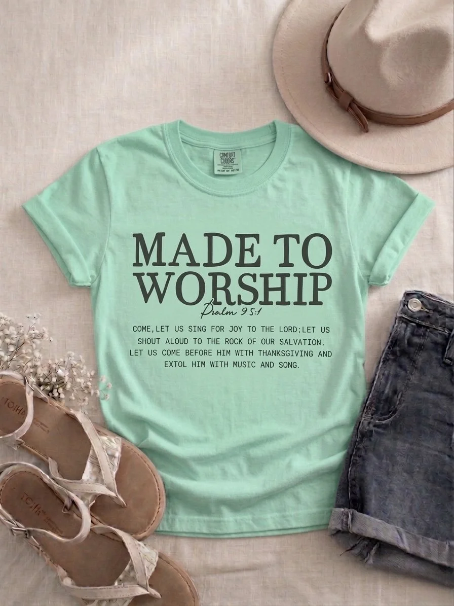 Shop › Made To Worship Image 1 of 1 Made To Worship $25.00 Psalm 95:1 reminds us to sing and shout our praise. David was a great poet and would often praise through music. Size: Small Medium Large X-Large XXLarge XXXLarge Add To Cart Added! Psalm 95:1 reminds us to sing and shout our praise. David was a great poet and would often praise through music.